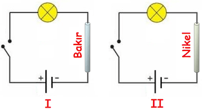 Eşit uzunluk ve kalınlıkta bakır ve nikel tellerden, nikel telin direnci bakırdan fazladır.