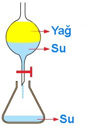 Su-yağ karışımı ayırma hunisine alınır, suyun aşağıya çökmesi beklenir.