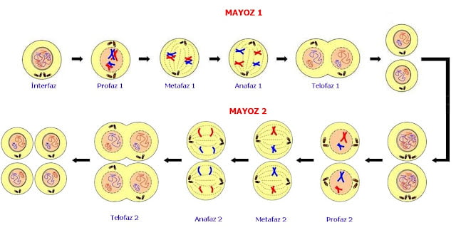 Mayoz bölünme mayoz1 ve mayoz2 olmak üzere iki aşamada gerçekleşir.