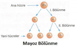 Eşeyli üreyen canlılarda üreme ana hücresinin bölünerek, üreme hücresi olan gametlerin oluşmasını sağlayan hücre bölünmesine mayoz bölünme denir.
