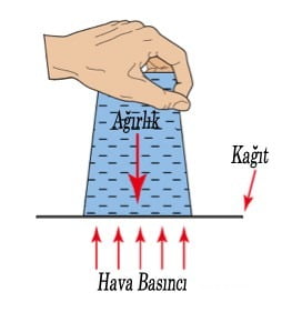 1. Aşağıdaki deneyde bardağın içerisine ağzına kadar su doldurulup, içinde hava kalmayacak şekilde üzeri kağıtla kapatılıyor. Bardak hızlıca ters çevrildiğinde suyun dökülmediği görülebilir. Aşağıdaki hava basıncı suyun dökülmesini engellemiştir.