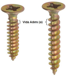 Vida adımı küçük olan vidaların (Solda) kuvvetten kazancı fazladır, fakat döndürüldüğünde daha az saplanır.