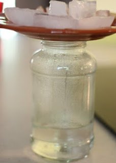 c- Buz küplerini kase üzerine koyuyor ve kavanozun üzerine yerleştiriyor.