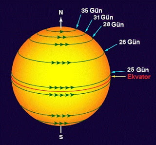 Güneş kendi eksenindeki dönüşünü yaklaşık 25 günde tamamlamaktadır. (Ekvatorda)