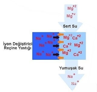2. İyon değiştirme yöntemi: Su arıtma cihazlarda iyon değiştirici reçine yastıkları kullanılarak su yumuşatılır. Reçine yastıklarında bulunan Na+ iyonu ile Ca+2 ve Mg+2 iyonları yer değiştirir.